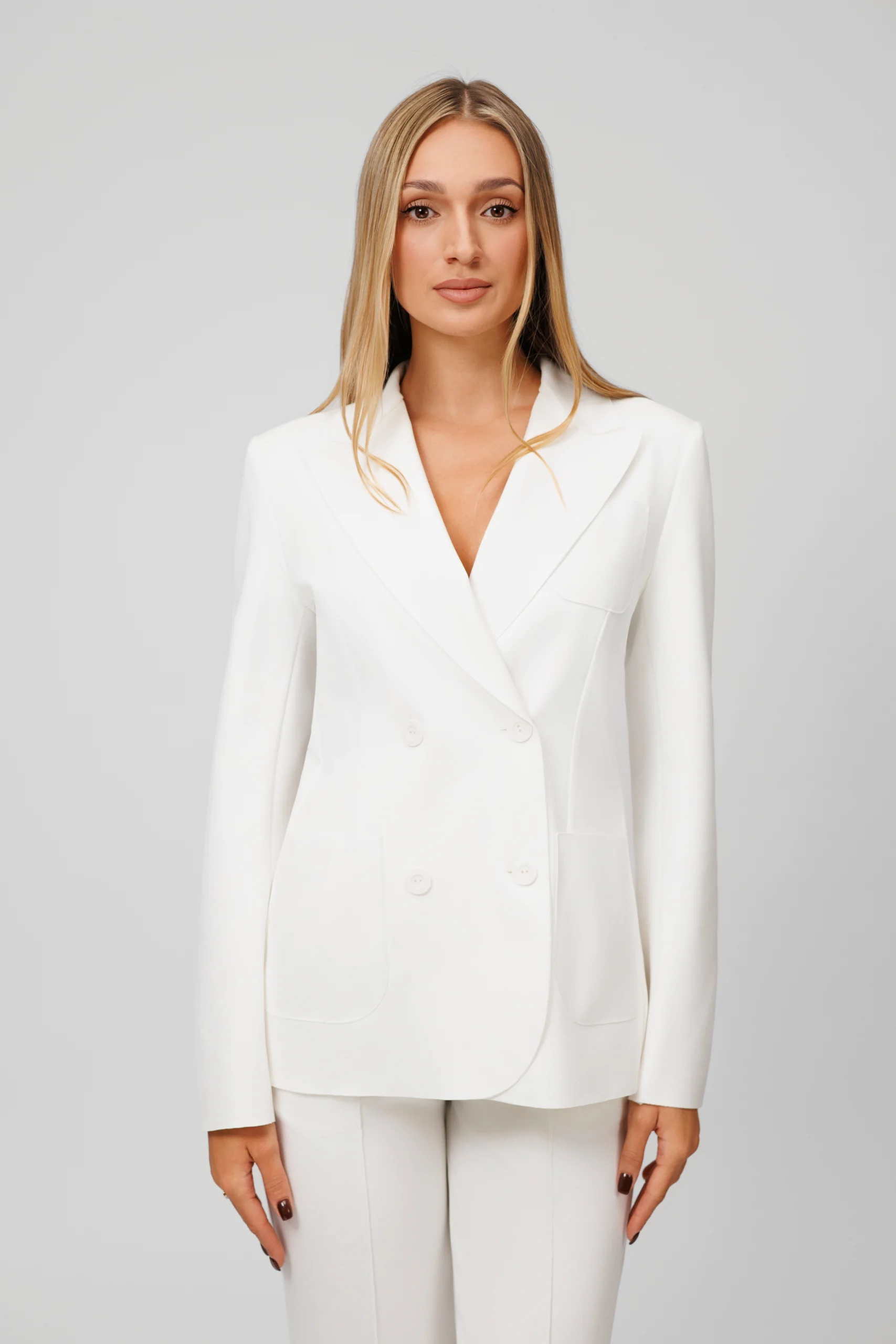 Dwurzędowa marynarka damska Humwear to esencja nowoczesnej elegancji w sportowo-casualowym wydaniu. Wykonana z wysokiej jakości, elastycznego materiału, doskonale układa się na sylwetce dzięki delikatnemu taliowaniu i wszytym poduszkom, które nadają jej zgrabną formę. Cztery logowane guziki podkreślają charakter premium, a surowe cięcie przy rękawach dodaje lekkości i nowoczesnego wyrazu. W połączeniu ze spodniami z tej samej linii tworzy spójną, stylową całość w formie nowoczesnego garnituru.