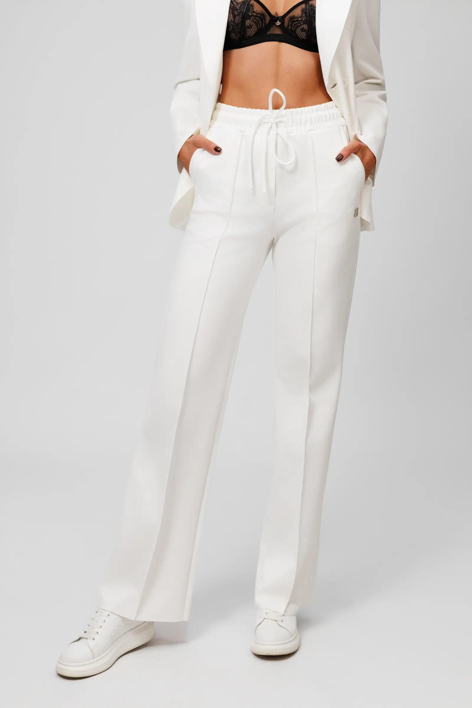 Idealne dopełnienie marynarki — spodnie, które tworzą spójną całość. Nasze spodnie zostały zaprojektowane tak, aby perfekcyjnie współgrać z marynarką, tworząc nowoczesny, sportowo-casualowy komplet. Ten sam materiał, ta sama dbałość o detal i ta sama minimalistyczna linia sprawiają, że oba elementy razem tworzą harmonijną sylwetkę.