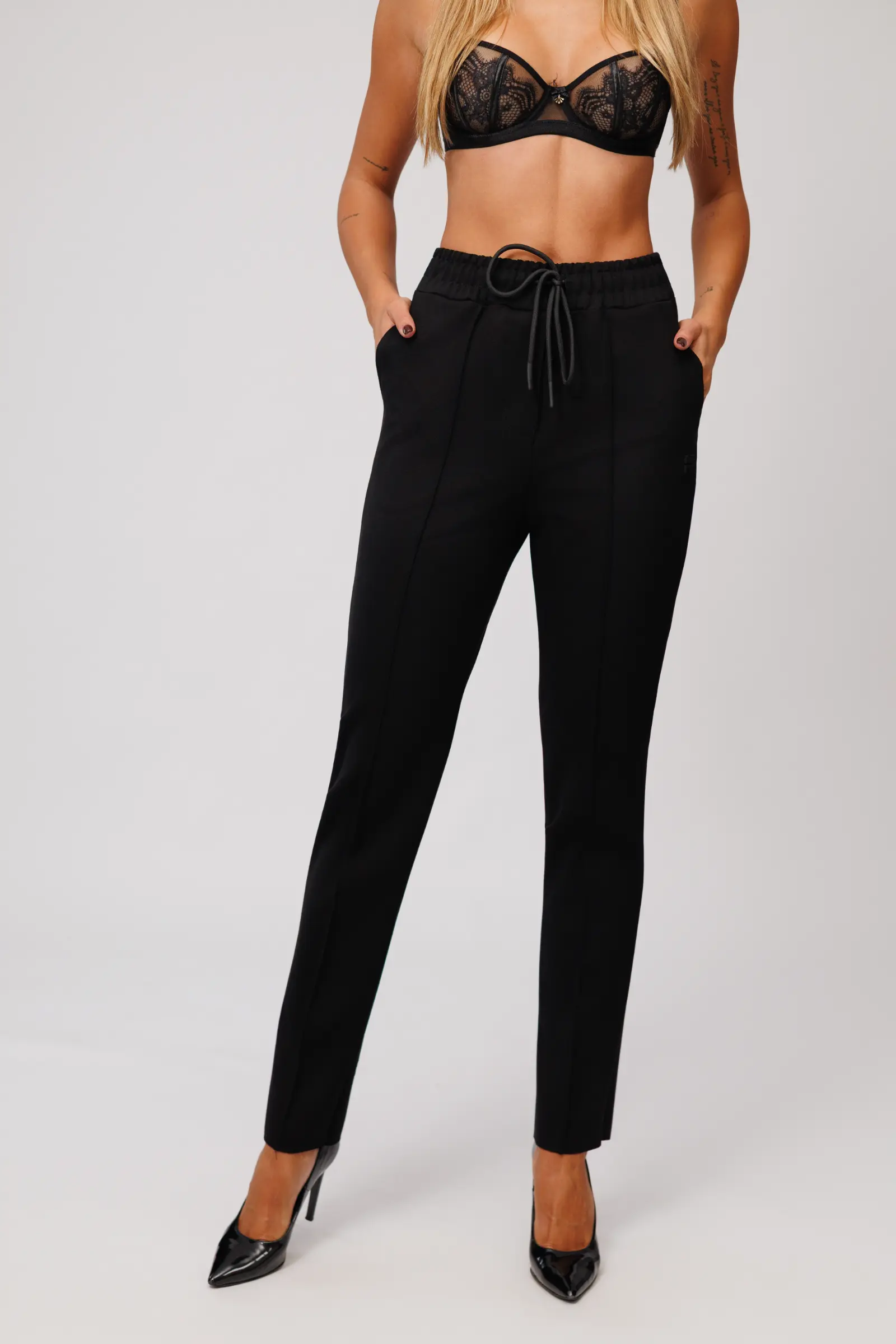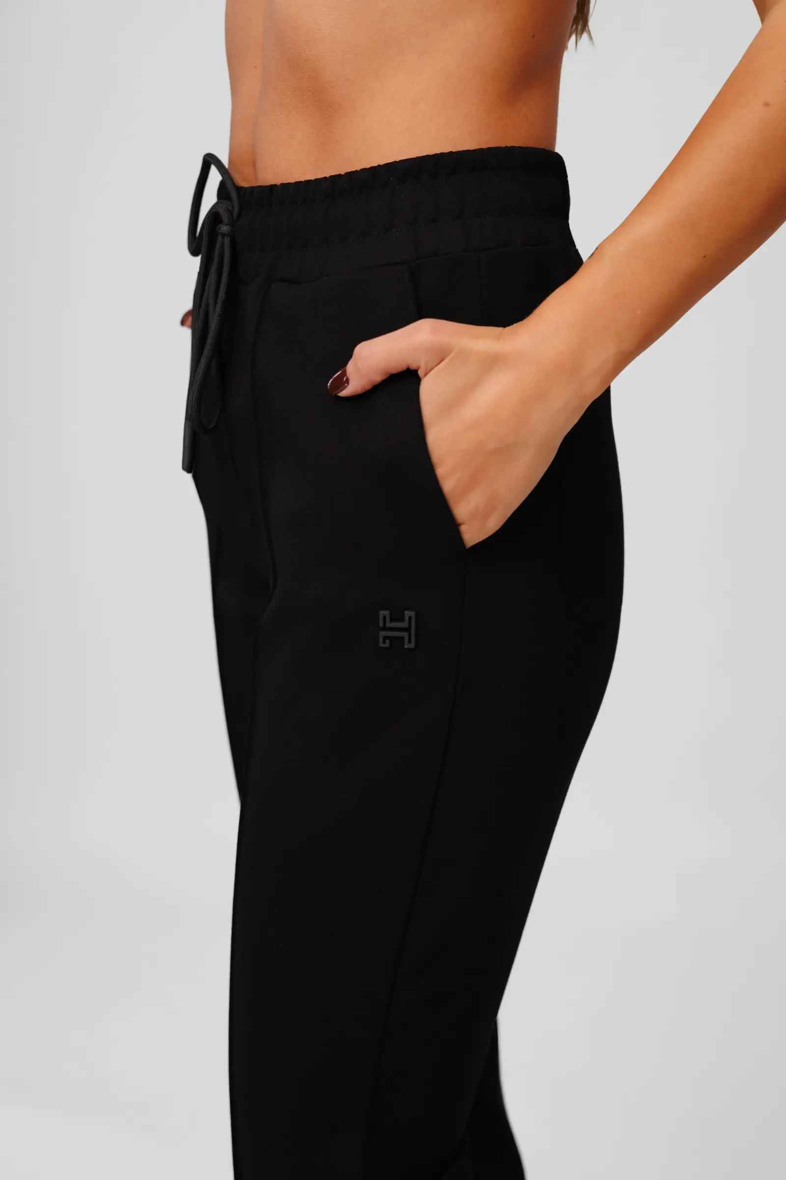 Czarne spodnie Humwear w zwężanej wersji to połączenie stylu i wyjątkowego komfortu. Wykonane z bardzo elastycznego materiału, idealnie dopasowują się do sylwetki, gwarantując swobodę ruchu i pełną wygodę noszenia. Posiadają wysoki stan, elastyczną gumkę w pasie z dopasowanym kolorystycznie sznurkiem oraz praktyczne kieszenie po bokach i z tyłu. Surowe cięcie oraz przeszyty kant na przodzie nogawek nadają im nowoczesny, sportowo-elegancki charakter.